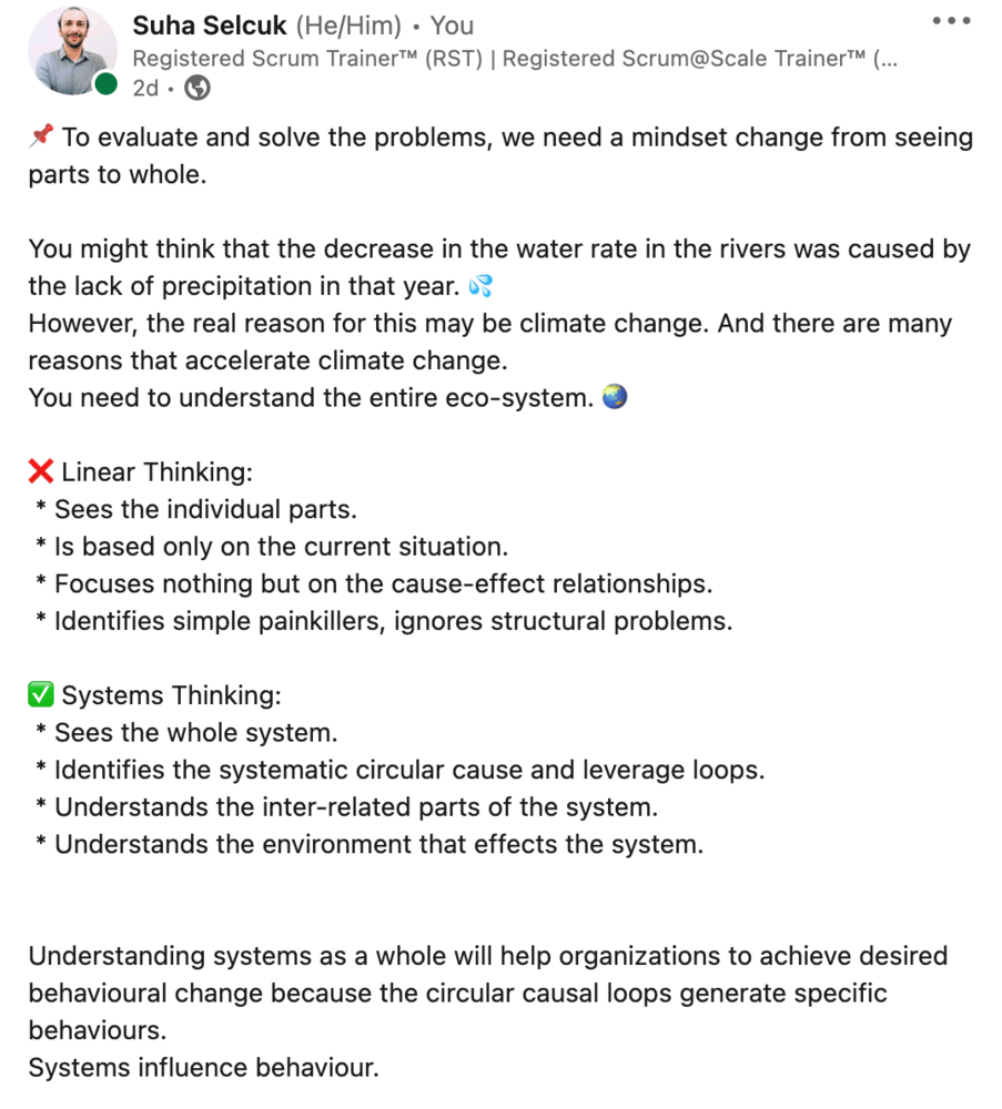 However, within the context of my LinkedIn post, “to see the whole” apparently refers to the holism. It underlines being aware that there is a whole which is different from its parts and interactions, and taking it into consideration, not ignoring the whole which is related to the context also. What I was saying with my post is this: “we need to stop conventional thinking and start to consider the whole and understand the inter-related parts, feedback loops and the environment of it.”