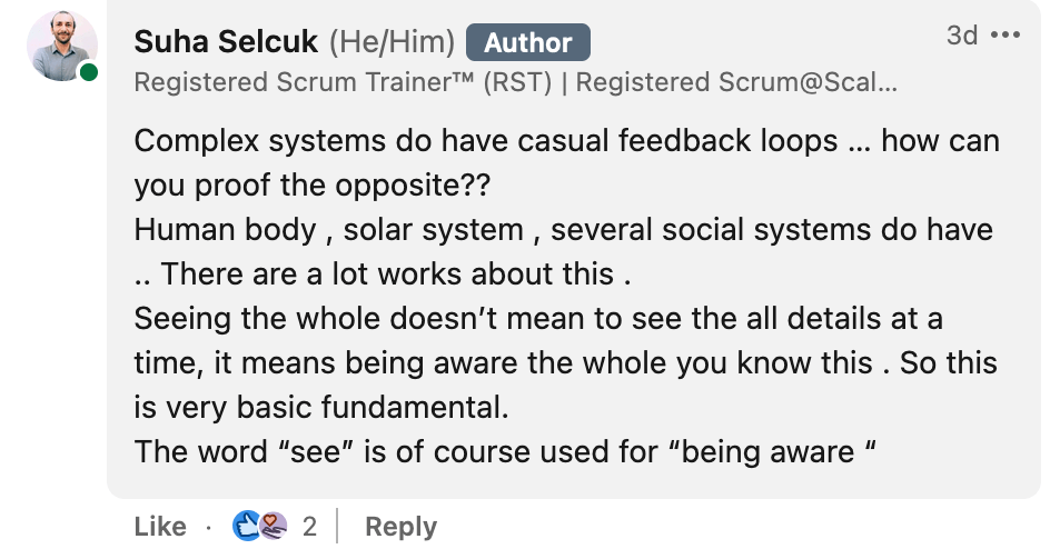 So in my post I used the term “Linear thinking” and this usage doesn’t show that I ignore the reductionist approach to analyze the inter-related parts of the system. And also on the right side under the Systems Thinking column I expressed the sub-systems as “Understands the inter-related parts of the system.” Whenever people see the words, “Linear” and “Part” they thought that I ignore to consider relations between the subsystems. Of course it was not my intent and before posting I didn’t think that people will take it like this.