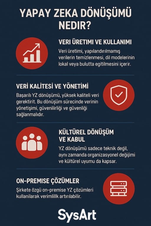 Yapay zeka dönüşümü organizasyonların karar alma süreçlerinden operasyonlarına kadar tüm yapısal işleyişlerini veri odaklı ve öğrenebilen sistemlerle yeniden inşa etme sürecidir. Bu dönüşüm, sadece bir yazılım güncellemesi değil, bir zihniyet ve kültür değişimidir. İşte bu dönüşümün temel yapı taşları: